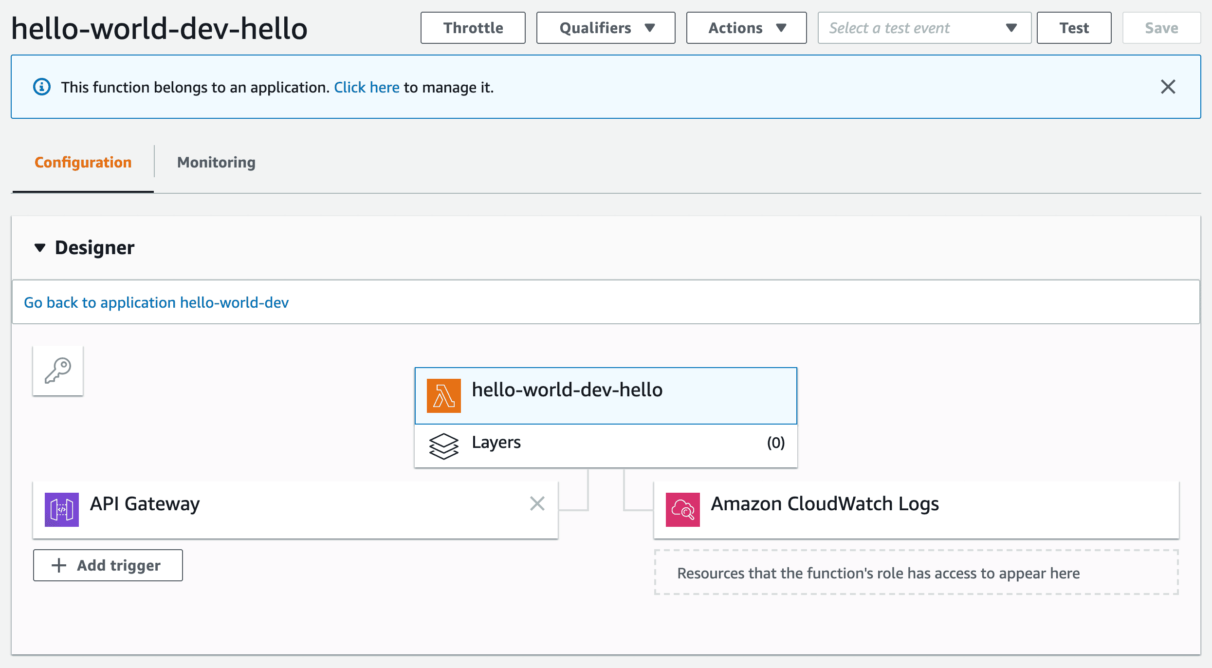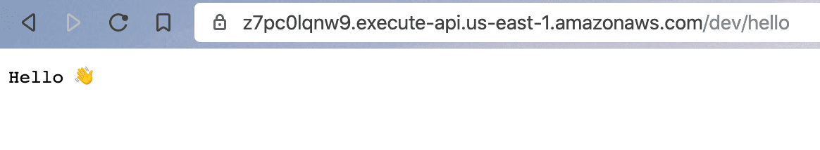 You get a URL for your lambda and some debugging output. My URL is https://z7pc0lqnw9.execute-api.us-east-1.amazonaws.com/dev/hello